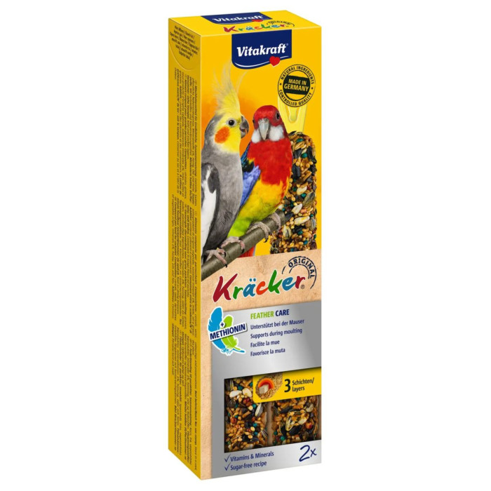Крекер для середніх папуг у період линяння - смачне та корисне доповнення до основного раціону вихованця. Ласощі є додатковим джерелом вітамінів і мінералів та амінокислот. Сприяє підтримці оптимального стану великих папуг та задовольняє потребу птахів у сточуванні дзьоба. Крекер Vitakraft полегшує процес зміни пір'я птахів. Він містить життєво необхідні мінерали та вітаміни, полегшує линяння і робить птицю життєрадісною та рухливою. Виготовлений за унікальною технологією 3-ступінчастого запікання і не містить цукор. В упаковці 2 крекери.
