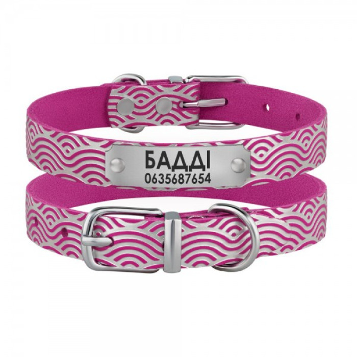 Нашийник для собак шкіряний Classic одинарний з срібним тисненням Хвиля Рожевий, L 33-43 см