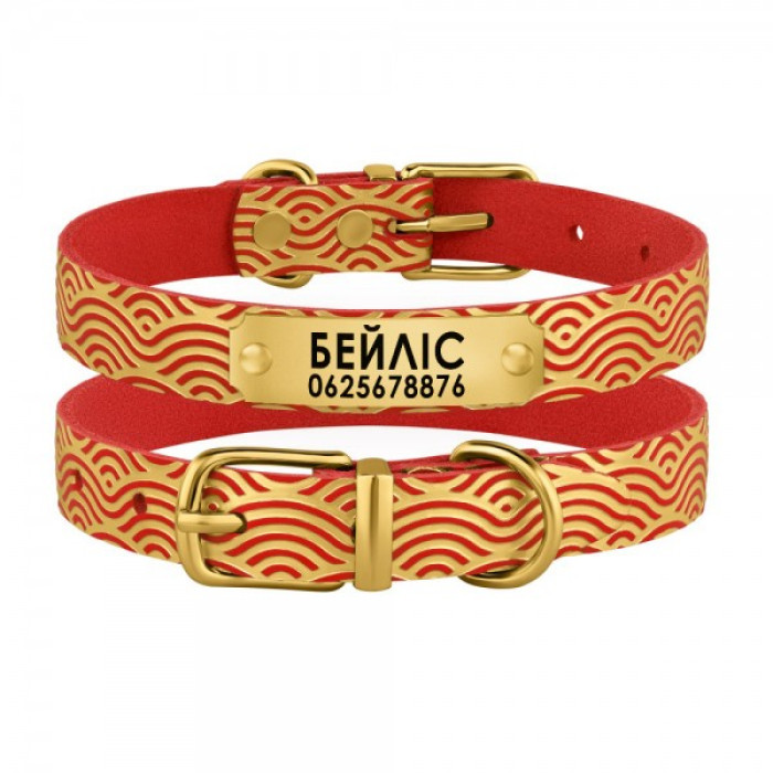 Нашийник для собак шкіряний Classic одинарний з золотим тисненням Хвиля Червоний, XS 18-25 см