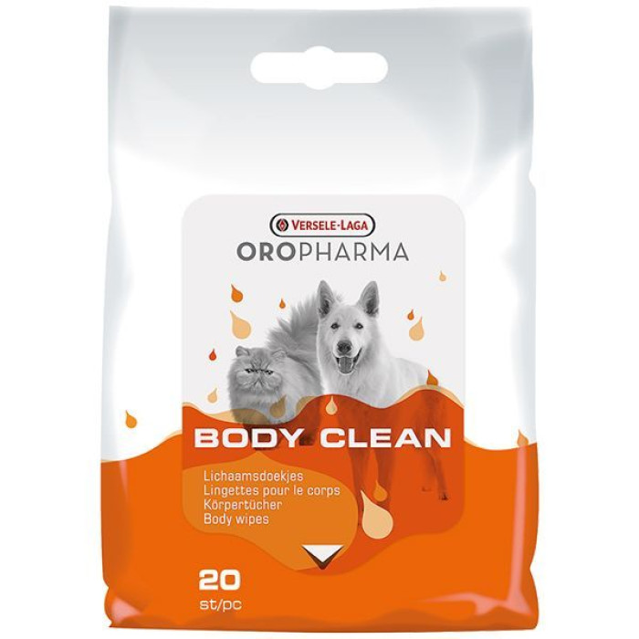 Oropharma Body Clean - вологі гігієнічні серветки для тіла та лап собак та котів. Відмінно очищають шерсть і шкіру, добре справляються із забрудненнями та забезпечують підтримку гігієни вихованця у проміжках між купаннями. Вологі серветки стануть чудовою альтернативою сухому шампуню для тварин, коли немає можливості повноцінно викуповувати вихованця, особливо в подорожі або після операцій.