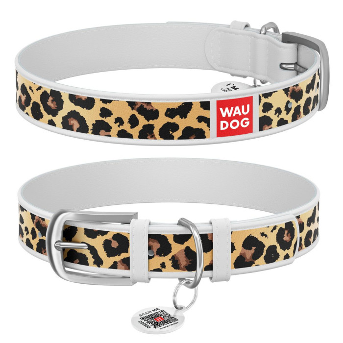 Нашийник WAUDOG Design з малюнком "Леопард", преміум шкіра, метал. пряжка, білий M 30-39см