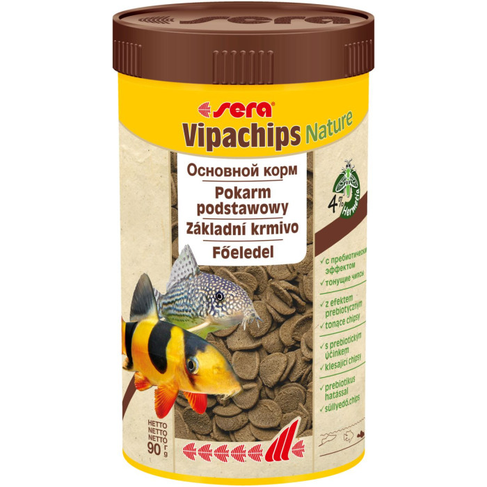 sera віпачіпс Nature – це основний корм, що складається з швидко тонучих чіпсів без барвників і консервантів для всіх риб, які харчуються на дні. Збалансований склад з натуральними інгредієнтами і пребіотиками дозволяє харчуватися в умовах, близьких до природних, що сприяє здоровому зростанню та інтенсивному розвитку. звички годування донної риби, не забруднюючи воду.