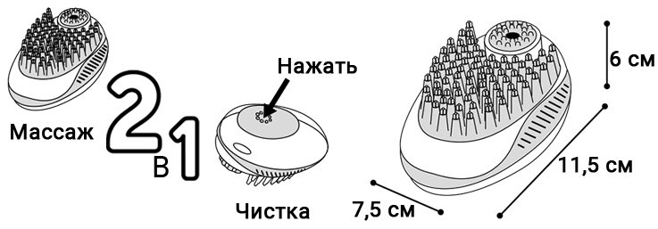 - з одного боку - розташовані віялом щетинки з м"якої гуми для вичісування;