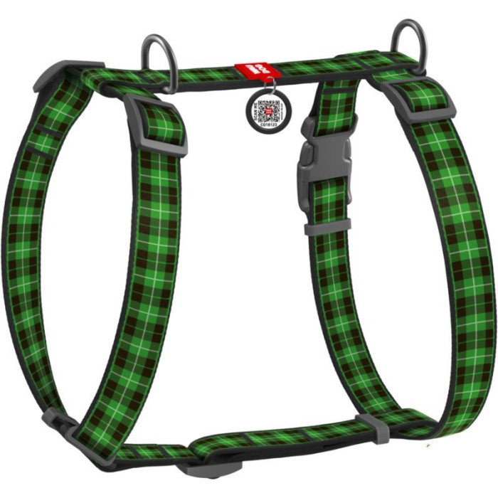 Шлея для собак анатомічний H-подібний WAUDOG Nylon з QR паспортом, з малюнком "Шотландка зелена" S 30-50см