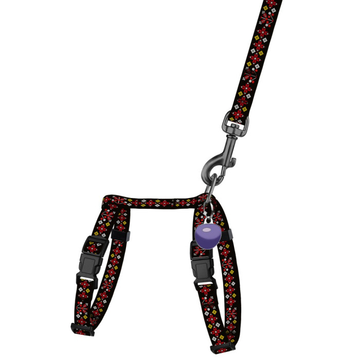 Шлея з Повідцем для Котів та Дрібних Собак Urban з QR-адресником Вишиванка Чорна 2XS 15-25 см