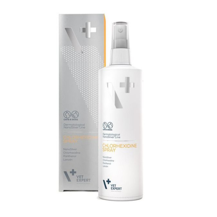 Спрей VetExpert (ВетЕксперт) НаноСрібло з хлоргексидином при шкірних ураженнях, бактеріального походження для собак та котів (наносрібло, хлоргексидин, пантенол, ланолін), 100 мл