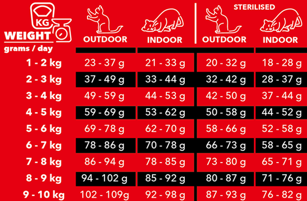 Рекомендовані добові норми годування для дорослих і стерилізованих котів наведені в таблиці. Ці норми є на кожному пакунку товару.