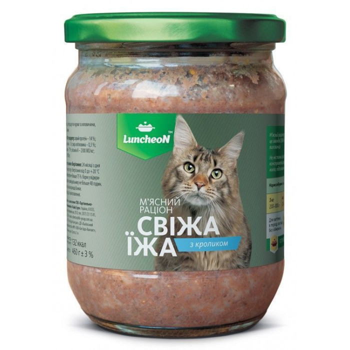 Консервований корм Свіжа їжа для кішок з кроликом, 460 г&nash; вологий корм преміум класу для кішок всіх порід та вікових груп. При виробництві свіжої їжі для кішок з кроликом використовується тільки якісна сировина у вигляді м'яса кролика, субпродуктів яловичини, злаків та овочів. Рекомендований для щоденного годування домашніх улюбленців. Гарбуз у складі корму сприяє поліпшенню травлення кішки, а також рекомендується для годування тварин з чутливим травленням і схильних до набору зайвої ваги.