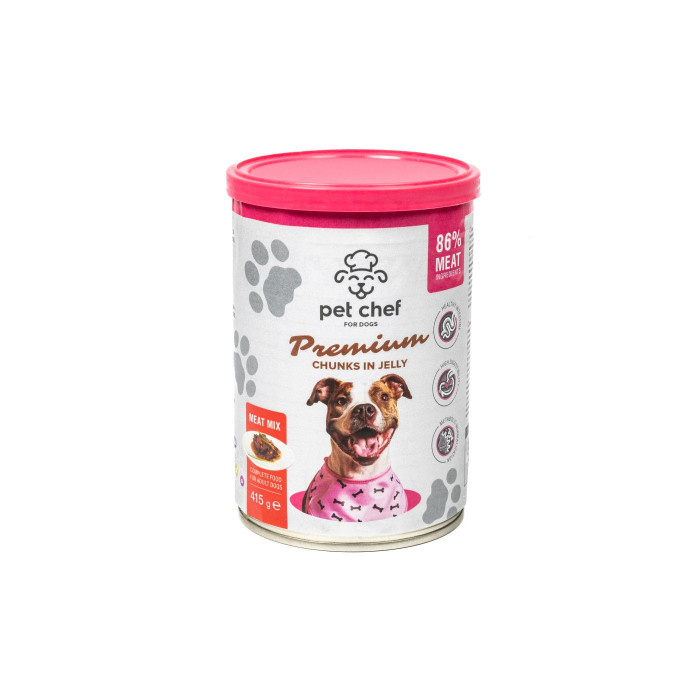 М’ясні шматочки в желе Pet Chef — це збалансований повнораціонний вологий корм для дорослих собак, який є чудовим вибором для тих, хто хоче забезпечити своїх улюбленців смачним та поживним раціоном. Кожен шматочок корму містить мінімум 85% м’ясних інгредієнтів, що задовольнить потреби тварини у білках та енергії, а також оптимальну комбінацію макро- і мікроелементів, вітамінів і амінокислот, необхідних для її розвитку та загального здоров’я. Желе підсилює апетитність, роблячи кожен шматочок надзвичайно соковитим і ароматним.
