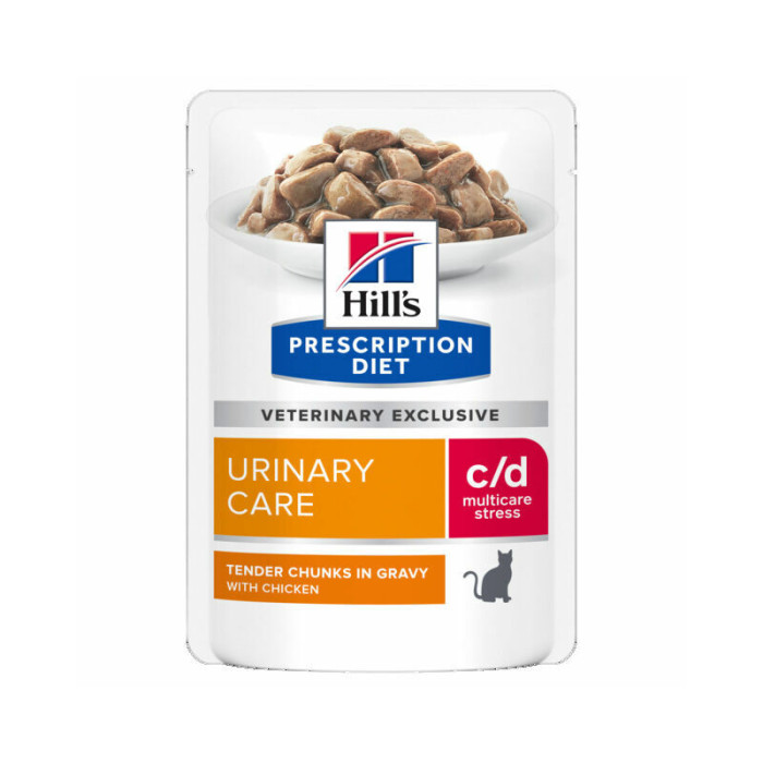 Дієтологи та ветеринари Hill's розробили дієтичний корм Prescription Diet c/d Multicare Stress, спеціально призначений для підтримки здоров'я сечовивідних шляхів кота, а також для боротьби зі стресом. Фактично, c/d Multicare – це клінічно протестований корм, який знижує частоту виникнення найпоширеніших симптомів сечовивідних шляхів на 89%. Цей вологий корм виготовлений з куркою та має неперевершений смак, який сподобається вашому коту.