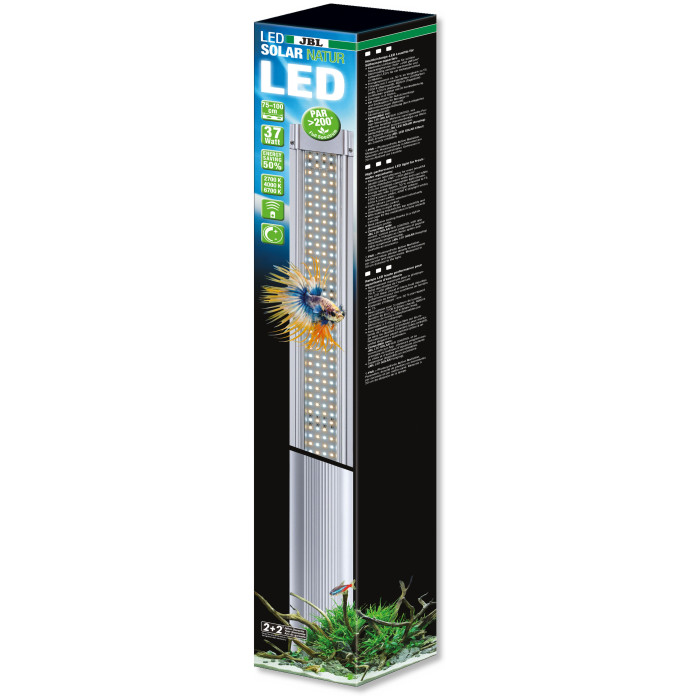 Особливості нових світильників JBL LED-SOLAR: СІД-лампи JBL LED SOLAR доступні як заміна для люмінесцентних ламп ВСІХ довжин. Базове обладнання JBL SOLAR NATUR містить, крім світильника, пульт дистанційного керування для простого та професійного керування лампою. За допомогою ІЧ-пульта дистанційного керування можна одночасно керувати кількома системами JBL LED SOLAR, оскільки частота ІЧ-приймачів ідентична. Якщо ви не бажаєте цього, ви повинні перемістити приймачі трохи далі один від одного. Тоді кожен світлодіодний блок може керуватися індивідуально за допомогою одного пульта дистанційного керування.